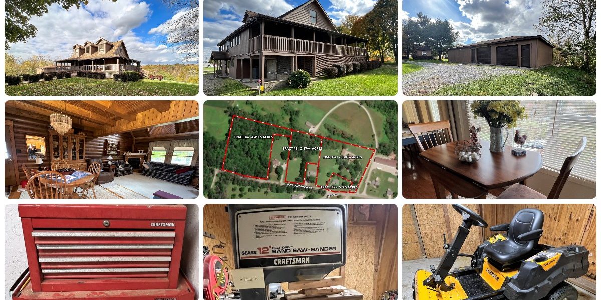 12.5+/- ACRES – 4 TRACTS – WAYNE TWP. – FRANKLIN LOCAL SCHOOLS – 3 BR 2 BATH RUSTIC LOG STYLE HOME – 28’X52’ POLE BUILDING – 2 BR 1 BATH RANCH HOME – GREAT RECREATION – BUILDING SITES – OPPORTUNITY KNOCKS!!