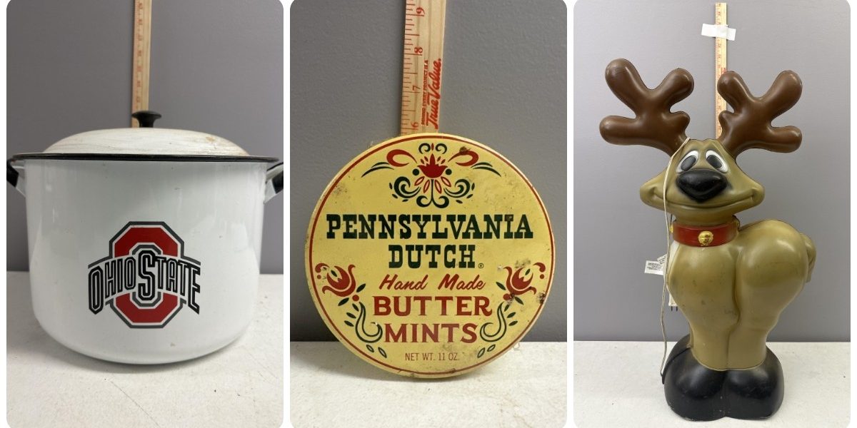 Christmas blow molds to include large Santa, reindeer, candy canes and more; vintage scales; check protector; minnow buckets; Old Spice bottles; cake plates and stands; stamp dispenser; canisters; cabbage shredders; glass medicine bottles; glass milk jugs; glass Pepsi-Cola bottles in Pepsi crate; Christmas trees; mannequin; shelves; Caldwell Fire Co. stretcher; wooden ironing boards; wooden Santa décor; vintage tins; jars; Barq’s glass bottles; McCoy pottery; stone crocks; Alpine pottery; kitchen glass wear; spice jars; powder sugar sifters; thermoses; ABC plates; trays; oil lamps; Corning Ware; lamps; wooden boxes and crates; vintage games; rug beaters; globes; mini vanities; baseballs; license plates; books; antique signs; vintage Christmas bulbs; wooden stools; coolers; suitcases; Longaberger baskets; picnic baskets; printer press drawers; decorative framed photos; framed chalkboards; candle stick holders; glass plates; Christmas villages; nativity scenes; wreathes; washboards; sward; Pyrex bowl; cornbread molds; postcards; mailboxes; and more!& much more! Opportunity Knocks!!!