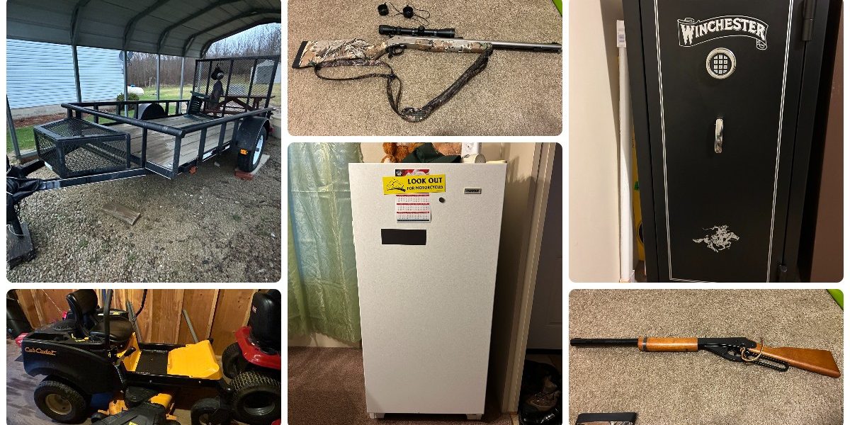 CUB CADET RZT-L ZERO TURN MOWER – CRAFTSMAN ST2000 RIDING MOWER – CRAFTSMAN YTS3000 RIDING MOWER – SWISHER TRIM & MOW – SELF PROPELLED PUSH MOWER – POULON PRO CHAINSAW W/CASE – POWER WASHERS – MOSSBERG 12 GUAGE – MOSSBERG 20 GUAGE – SLUG MODEL 12 GUAGE761 SEARS ROBUCK & CO. W/BALL SCOPE – CAMMO WOLF MAGNUM/CONNECTICUT VALLEY ARMS 50 CAL. MUZZELOADER W-SCOPES– WINCHESTER GUN SAFE – METAL GUN CABINET – TRAVELING GUN CASE – -04’ & 16’ ALUMINUM EXTENSION LADDERS – 5 1/2’ X 10’ TRAILER – DEER FEEDER – AND MORE– OPPORTUNITY KNOCKS!!!