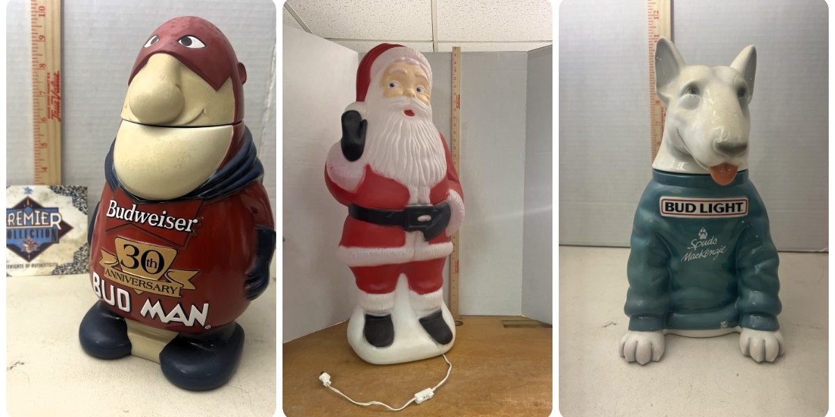 ANTIQUES & COLLECTIBLES: Frederick Remington Bronze statues, Budweiser beer steins, German beer steins, Lenox glass, Anheuser Busch mugs, Budweiser Bottles, Avon John Deere Steins, Bohemia Glass vases, Jim Beam Decanters, Bud Light serving Platers, Christmas Plates, Retro Mail Scales, Military Helmet, Milk Bottles, Stone Jugs, Coleman Cooler, Hanging Scale Weight, Corn Jobber, Cash Register, Plastic candle lights, Butter Churn, Shoe Cleaning Kit, Paperweights, Budweiser Platers, Bohemia Lamps,